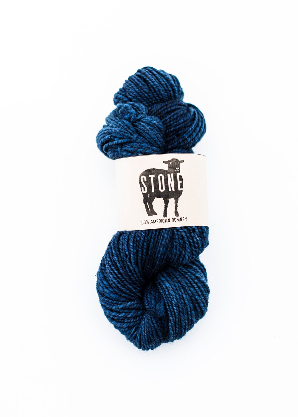 100% American Romney Handspun, 2-ply light worsted weight handspun. Indigo dyed.